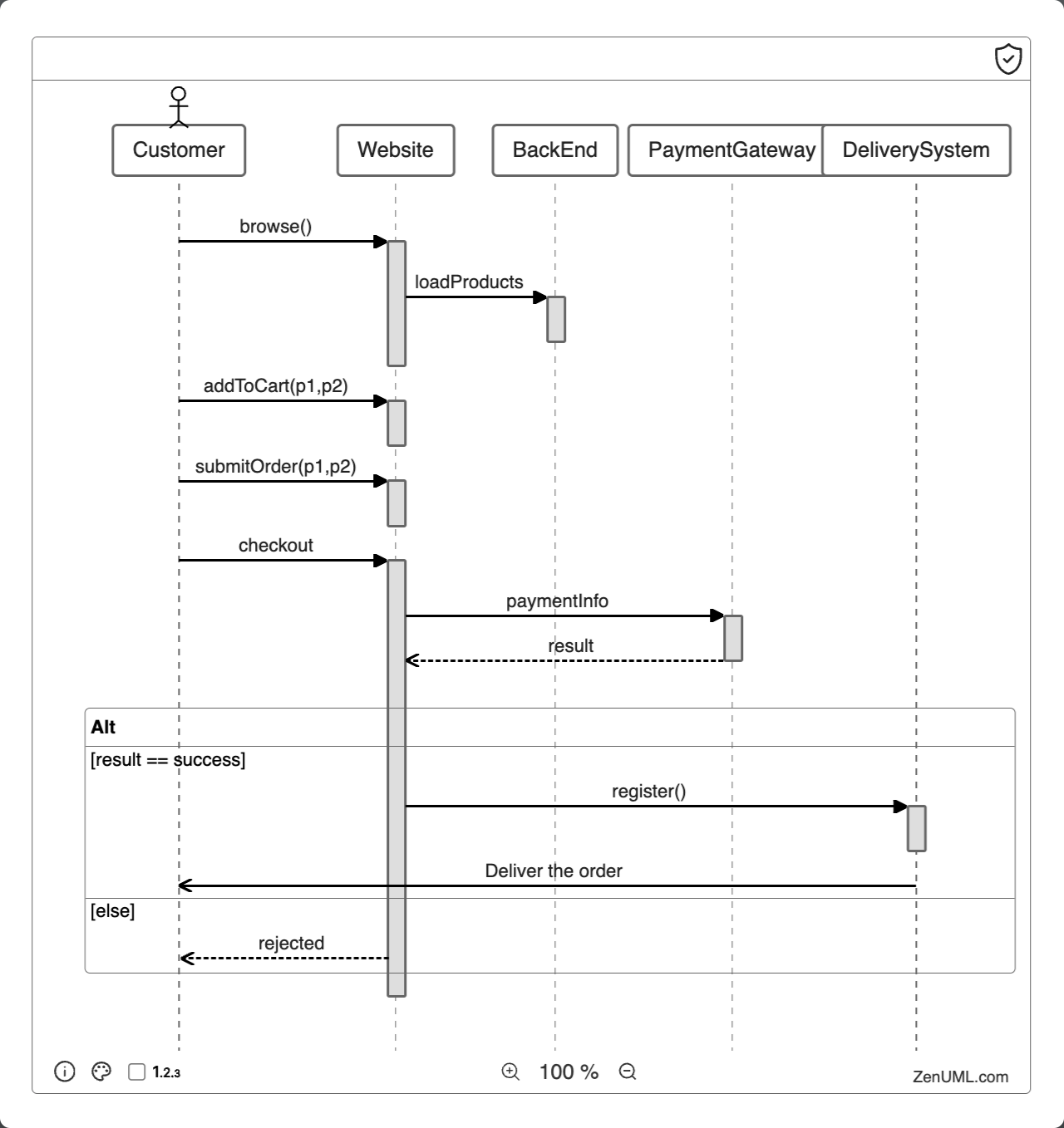 Sequence diagrams hold notable significance in dynamic modeling as they elucidate the joint operation of a group of objects. They are extensively utilized in conjunction with UML (Unified Modeling Language) to depict a visually homogeneous procedure further employed to design a software system. This particular example models the logic behind a complex process - in this context, online shopping.